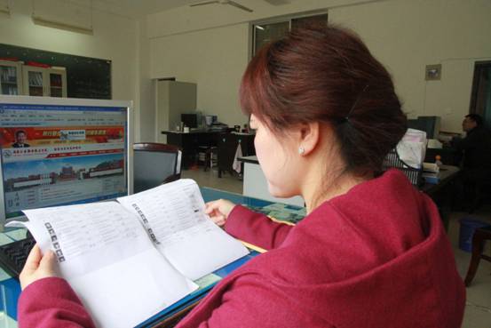 指针指向下午2点,这个时段正是学生们的上课时间,办公室里静悄悄的,贺梅春在仔细核对学生英语等级考试的信息表。