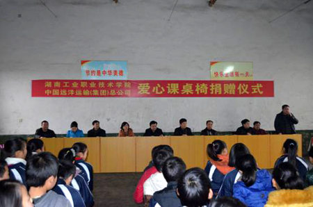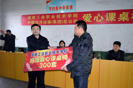 近日,在安化南金乡中心学校的爱心课桌椅捐赠仪式上,我院党委副书记周立华及党政办、学生工作处、院团委相关负责人一行代表学院为孩子们送去了三百套爱心课桌椅,同行的中国远洋(运输)集团总公司捐赠爱心课桌椅一百套。出席捐赠仪式的还有安化县人民政府副县长杨敬茂、团县委书记王伟俊、南金乡党委书记夏志才等。