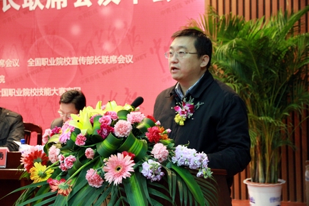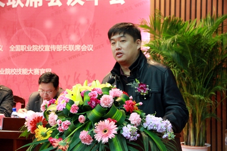 龙承海代表承办方讲话,对此次年会的召开表示衷心的祝贺,对我院概况做了简单介绍,特别指出我院2011年被评为“全国魅力校园”和“全国最具就业竞争力的高职院校”,2012年学院获“全国黄炎培职业教育优秀学校奖”,并表示我院将借助此次年会契机与各兄弟院校加大交流,坚持以“十八大精神”为指导,共同努力,做好学院各项工作,充实校园文化,构建和谐美丽校园。