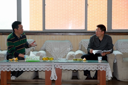 省教育厅财务基建处副处长俞志松(右)询问我院副院长钟晓林(左)饭菜价格平抑基金的设立和使用情况