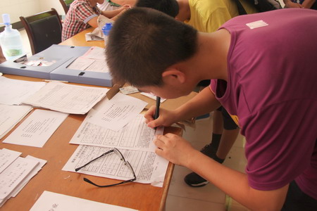 长沙的秋天,35度高温,志愿者至始至终的热心引导和帮助让大男孩于泽杰有点不好意思。于妈妈则对志愿者的周到服务赞不绝口,要于泽杰虚心向学长学习。