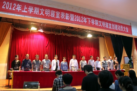 9月13日下午,我院2012年上学期文明寝室表彰暨2012年下学期文明寝室创建动员大会在大学生活动中心隆重举行。学院党委副书记周立华,学生工作处、院团委、后勤处、保卫处相关负责人,以及各(院)系总支书记出席会议并担任颁奖嘉宾。此次大会由学生工作处副处长梁艳主持。