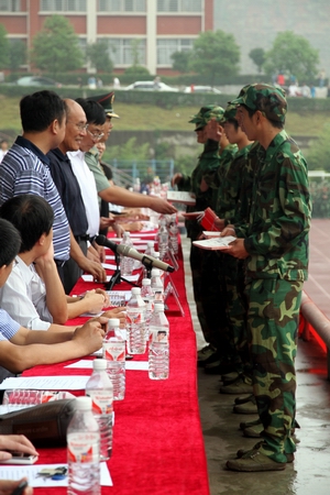 上午九时,庄严的升旗仪式后,学院党委书记龙承海在阅兵指挥员的陪同下逐一检阅军训方阵队。新生们一声声饱满的“首长好”、“为人民服务”响彻学院上空。随后,在雄壮的分列式进行曲中,各连方阵着装整齐、精神抖擞、英姿飒爽,以嘹亮的口号、铿锵有力的步伐走过主席台,接受全体领导、老师及部队指挥员检阅。他们动作规范,很好地展示了军训成果,赢得了阵阵掌声和喝彩。