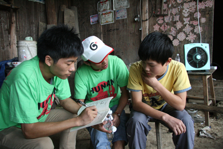 “洞市村红岩山上陶联香小朋友的母亲是聋哑人,家中还有两个兄弟,全家靠父亲下山打零工维持,一年收入不超过8000元。家中屋顶铺的是树皮和稻草。从山脚到其家中需步行一个多小时山路,极为不便,这一路走来,杨硕老师摔了三跤”。其中一位志愿者在当天的心得上写到,“当我们进门的那一刹那,环顾四周,一种心酸的感觉涌入心头。家徒四壁,只有满满的奖状;简单的桌椅,既是吃饭的地方,也是学习写作的地方;没有洗衣机,空调,唯一的家电是一部十四寸的电视机。由于超生,无法享受学校的补助。老二和老三都没有户口,和他们交流时,孩子们更多的时候是沉默。关注留守儿童,我们认为不仅要关注他们的衣食住行,更要时时刻刻关注他们心理问题,让他们感受到爱的存在,用我们的爱心让希望起航”。