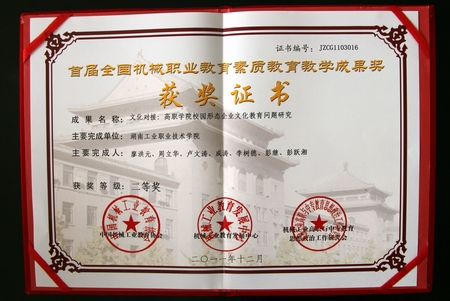 我院由廖洪元、周立华、卢文涛等人完成的《文化对接:高职学院校园形态企业文化教育问题研究》以及由王柏林、周立华、侯新华等人完成的《新形势下高职院校辅导员德育课创新与实践》均获首届全国机械职业教育素质教育教学成果奖二等奖,由刘建湘、张志勇、苏茂芳等人完成的《职业道德与企业文化修养》获得三等奖。与此同时,我院获首届全国机械职业教育素质教育教学成果奖优秀组织奖。