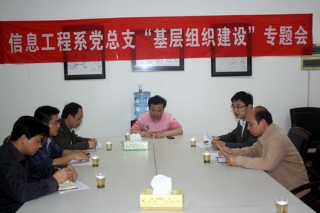 为响应学院党委号召,在创先争优活动中深入开展基层组织建设年活动,信息工程系党总支于4月23日下午组织召开了基层组织建设专题会,进一步推进基层组织建设工作,全系教职工党员参加了会议,蹲点院领导、学院党委副书记周立华应邀出席了会议。