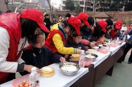 活动中,专业蛋糕师们完成蛋糕的主体制作,同学们与来自东塘社区福利院的孤残儿童则在蛋糕上进行DIY奶油绘制,并开展互动小游戏。红红的奶油为芯,满满的大爱为笔,不到五分钟时间,一幅大大的雷锋像跃然眼前,在阳光映照下,更是熠熠生辉。大家一起在蛋糕上点燃了蜡烛,共同许下了美好的愿望。小朋友们在游戏过程中他们感受到来自大哥哥大姐姐们的关怀和爱护,脸上绽开的阳光笑容无比灿烂。