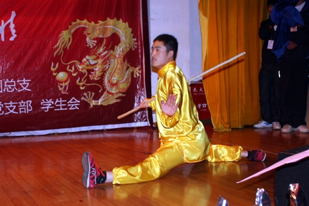 第二篇章——“春蚕赞”中老师的声声朗诵,祝福着即将迈向实习、工作岗位的大三学子,希望他们能够飞得更高、更远,也希望他们可以常回家看看;精彩的中国武术与双截棍的结合表演则将晚会推向高潮;动情的朗诵《感恩老师》——“老师你是园丁、老师你是蜡烛,老师你是灯塔、老师你是航帆”表现了学子对老师的感激之情;接下来师生同台演出的舞蹈《何茫然》、机械工程系主任皮智谋现场书写的书法作品“前程似锦”,表达的是老师对同学们的美好祝愿。