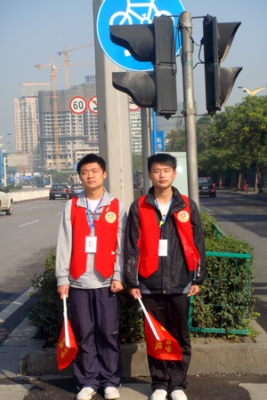 在活动中,志愿者被分为策划组、后勤组、外联组、宣传组和活动组五大组,他们各司其职、配合默契,对每一位来往于路口的市民认真指导,态度谦和。在红灯亮起停止过马路时,他们抓紧时间向等待中的市民讲解交通规则;在绿灯行时,他们为市民吹哨指挥,主动帮助体弱老人过马路,使整个路口交通井然有序。与此同时,同学们在现场还开展了遵守交通文明行签名活动,吸引了众多路人上前签名,他们对同学们的志愿者行为表示赞赏和肯定。