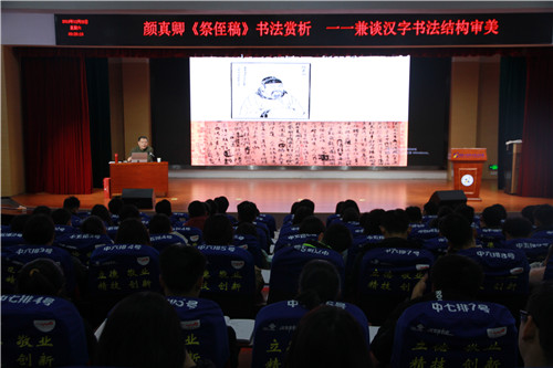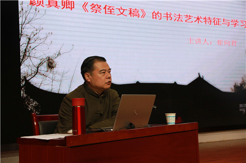 随着热烈的掌声,崔尚君开始了题为“颜真卿的《祭侄文稿》书法赏析——兼谈汉字书法结构审美”主题演讲。他从字形结构组合和通篇局介绍了《祭侄文稿》的书法艺术特征,讲述了颜真卿书法创作的过程,分享了颜真卿求学的故事,他还通过朗诵让在场同学对书法有更深刻体会。