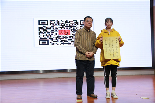 讲座结束后,现场观众意犹未尽,同学们就感兴趣的问题向崔向君进行了提问,崔向君一一为大家耐心解答。最后进行了抽奖的环节,奖品分别是崔向君先生的一幅书法作品、高浪书法班高勇波老师的三幅书法作品、校团委副书记李陟威的四幅书法作品。崔向君先生还为楚艺书法协会牌匾进行了提字。