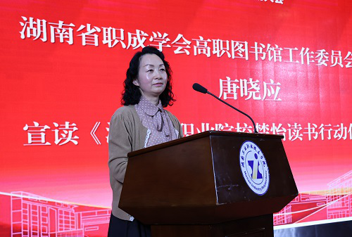 湖南省职成学会高职图书馆工作委员会秘书长唐晓应宣读《湖南省职业院校楚怡读书行动倡议书》
