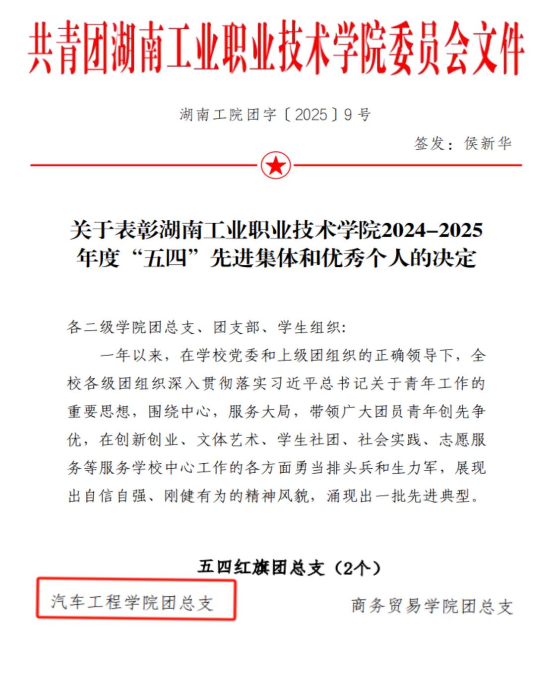 近日,学校发布《关于表彰九游·官方网站2024-2025年度“五四”先进集体和优秀个人的决定》,汽车工程学院获“五四红旗团总支”等多项荣誉,展现出学院青年师生的卓越风采与责任担当。