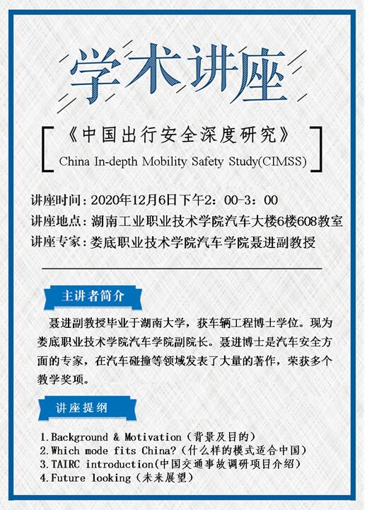 12月6日下午,娄底职业技术学院汽车学院副院长聂进博士应邀在汽车大楼608教室为我院学子做了一场以“中国出行安全深度研究”为主题的学术讲座。讲座从出行安全、汽车碰撞、交通事故等方面入手,通过聂博士实际参与的案例以及小鹏汽车等企业的实际研究现状,详细的介绍了智能驾驶的发展、ADAS(智能驾驶辅助系统)的研究、汽车智能技术方向的就业岗位。
