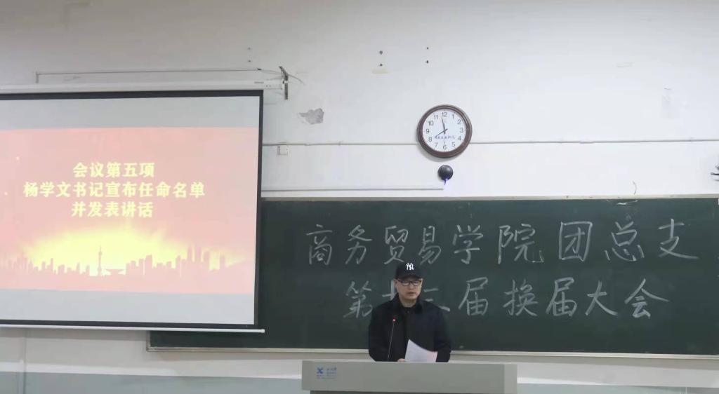 杨学文在大会上发表讲话,他向上届团总支学生会干部的出色工作表示肯定,同时向本届当选的学生会干部表示祝贺。他希望新一届团总支学生会全体干部注重自身修养,树立良好学生干部形象、认真履行学生干部工作职责,全心全意为商务贸易学院学生服务、成为校园安全稳定的维护者。