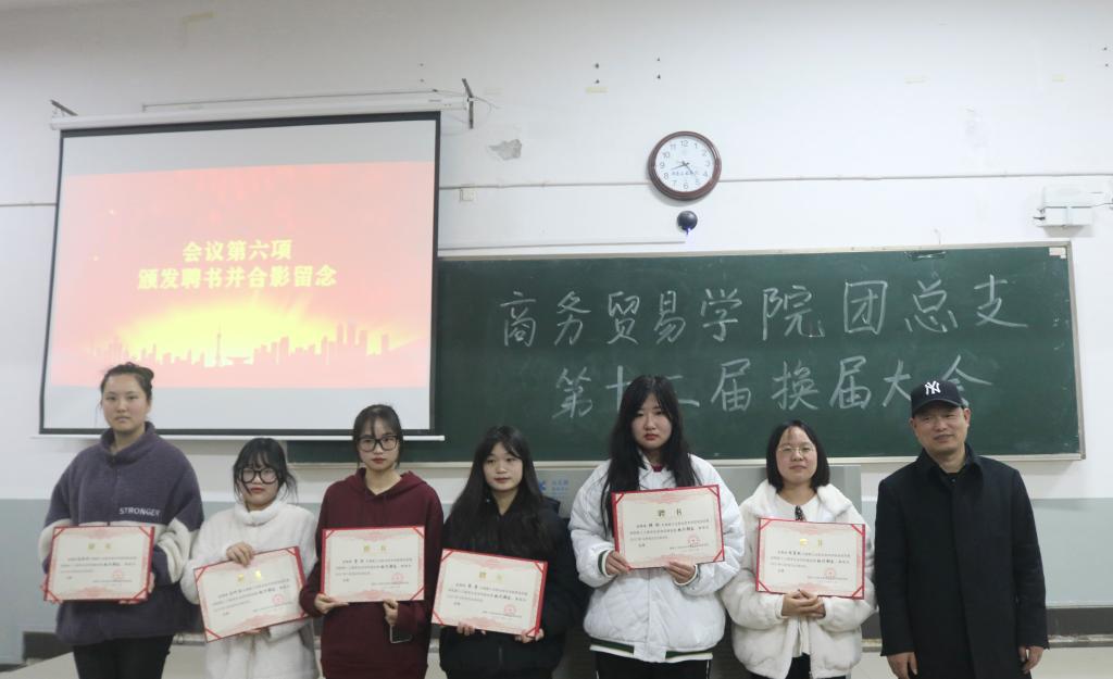 12月20日晚,商务贸易学院团总支2021年总结表彰大会暨第十三届换届大会在2101教室正式举行。商务贸易学院党总支书记杨学文,辅导员代表和全体团总支、学生会的干事参加大会。换届大会由组织部大三负责人章州主持。