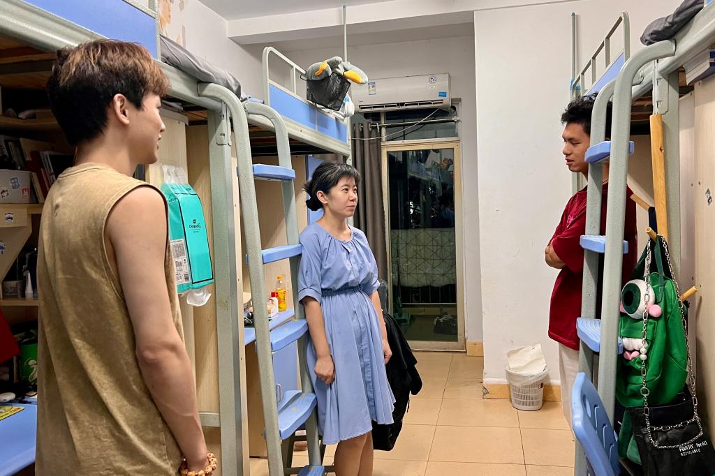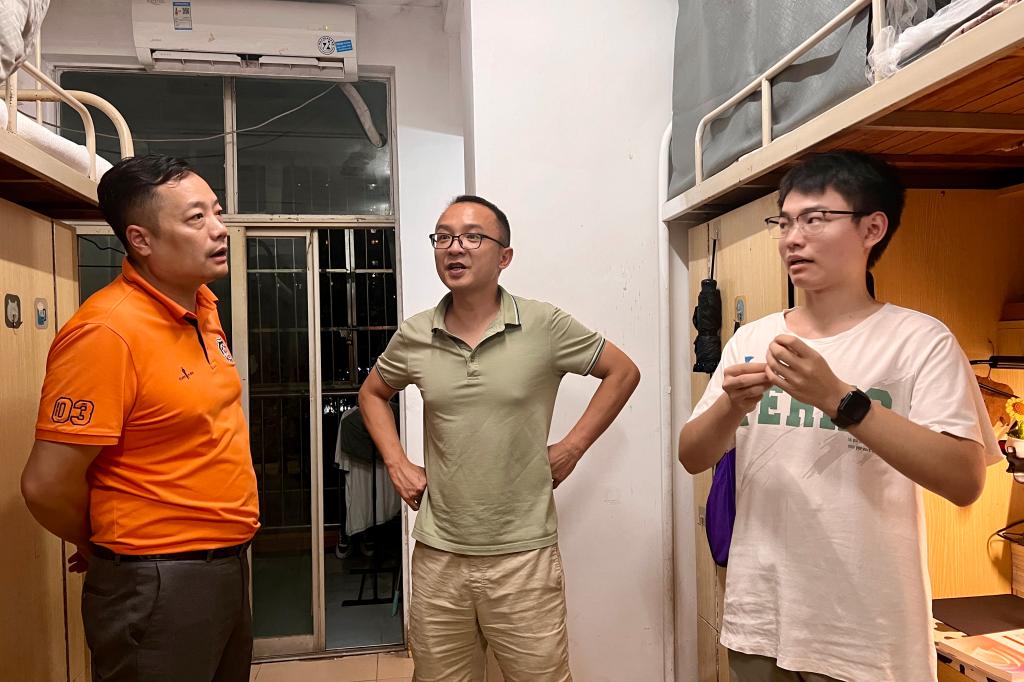 在走访过程中,段可一行与学生进行了亲切交谈。每到一处,他们首先向学生们致以新学期的问候,询问学生在宿舍生活中的具体情况,包括住宿条件、设施设备、生活习惯等方面。重点强调寝室安全用电、卫生状况等注意事项。鼓励学生积极营造一个安全、整洁的生活空间,为新学期的学习与生活奠定良好基础。