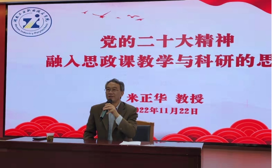 作为党的二十大精神“三进”的重要载体,高校思想政治理论课肩负着重要责任与使命,如何在思政课教学中准确融入党的二十大精神?米教授从宏观和微观两个层面讲授了党的二十大精神融入教学的主要内容和具体方法。同时,从九个方面总结了党的二十大报告中的新观点、新论断、新思想,为我院青年教师科研提供了研究方向。讲座内容异常精彩,既有理论高度又有实践指导意义,参会老师收获颇丰。