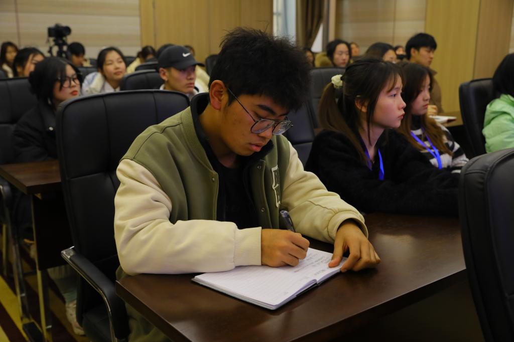 活动第二部分,学校党委书记刘建湘给同学们讲了一堂生动的思政课。刘书记首先肯定了青马社2023年所取得的成绩,对大家的成果汇报表示满意。接着,他以《光辉榜样——从毛泽东的成长谈谈青年学生的成长》为题,从“少立大志、勤学苦读”“深入基层、调查研究 ”“重视锻炼、强身健体”“总结经验,集思广益”四个方面讲述了毛泽东主席的故事。他紧密联系青年学生的成长,要求大家立大志,勤学苦读,多读有字之书学知识,多读无字之书增才干;重视锻炼身体,养成良好生活习惯;要善于总结经验,实现个人进步。最后,刘建湘书记对所有学生殷切寄语:“希望你们以毛泽东同志为榜样,以马克思主义为指导,牢记自己的使命与责任,发扬光荣传统、传承红色基因、赓续精神血脉,在新时代新征程上勇挑重担,奋勇争先,为以中国式现代化全面推进强国建设、民族复兴伟业而团结奋斗!”
