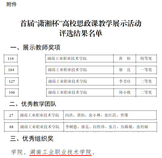 10月17日,湖南省教育厅公布了首届“潇湘杯”高校思政课教学展示活动评选结果名单。我校马克思主义学院教师黄怡斩获“毛泽东思想和中国特色社会主义理论体系概论”高职组特等奖,廖良斩获“思想道德与法治”高职组一等奖,李芳佳获得“习近平新时代中国特色社会主义思想概论”高职组二等奖,周小枚获得“形势与政策”高职组二等奖,向洪团队和李树德团队获得优秀教学团队奖,学校获得优秀组织奖,创造了我校参加本项赛事的最好成绩。
