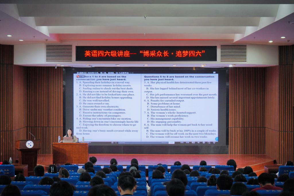 本次讲座深入细致地分析了英语四六级考试的题型,为同学们提供了有效的方法策略,提高了同学们的英语水平,也增强了同学们的备考信心,同学们都开始建立属于自己的英语考级目标。据悉,校学生会每学期都会举办英语四六级讲座,营造良好的学习氛围,帮助同学们更好地调整心态,提高英语四六级通过率。