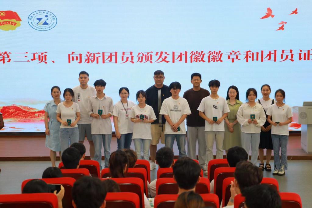 仪式在庄严的国歌声中拉开帷幕,校团委彭茜老师宣读了本次新发展团员名单。各二级学院团总支书记为新发展团员代表颁发团员证,并为他们佩戴团徽。这标志着他们正式成为共青团组织的一员,肩负起团员的责任和使命。在校团委组织部部长贺思嘉带领下,新发展团员们面对团旗,高举右拳,庄严宣誓:“我志愿加入中国共产主义青年团……”誓言铿锵有力,回荡在礼堂的每一个角落,展现了新团员们坚定的信念和决心。