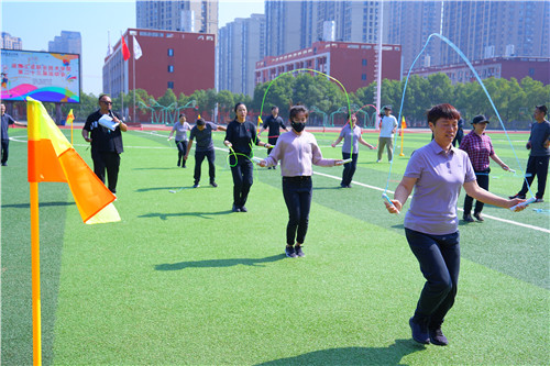 “旋风跑”比赛开始了,运动员们五人一组双手握长杆迅速冲出起跑线,绕标志筒顺时针旋转,并共同完成50米跑,整个动作行云流水般丝滑。“连体裤齐头并进”中,参赛者手挽手,或齐步小跑奔向终点,或谨慎地迈着小碎步走向终点。“50米迎面接力”中,随着场上发令枪声响起,跑第一棒的运动员如离弦之箭,奋力向前。“众星捧月”中,球被轻轻抛向空中,稳稳落下,一起一落,尽在掌握。“1分钟跳绳团体比赛”中,数十名参赛选手排成方阵进行个人跳绳,跳绳在空中飞舞,如同模糊的光影上下翻动。