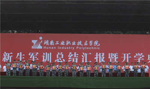 汇报表演结束后,副校长董建国宣读军训表彰决定,校领导为优秀教官、优秀连队、优秀个人代表颁发证书。