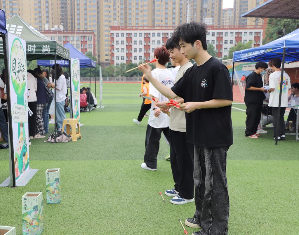 活动现场,五大民俗体验区各具特色。彩绘艺术区,同学们执笔在蛋壳上点染;巧手匠心区,一个个寓意平安的锦绣香囊跃然成形;传统竞技区,投壶的竹矢破空之声与喝彩交织;民俗智慧区,“射五毒”飞镖簌簌,演绎着古人除秽辟邪的生活智慧。许多同学将亲手制作的香囊赠予师友,传统祝福在校园里温情传递。学生工作部副部长杨迪禹表示:“本次活动以沉浸式体验为载体,搭建传统文化与青春对话的桥梁,让青年学子在欢乐中感知端午文化精髓,在互动中传承民俗智慧。”