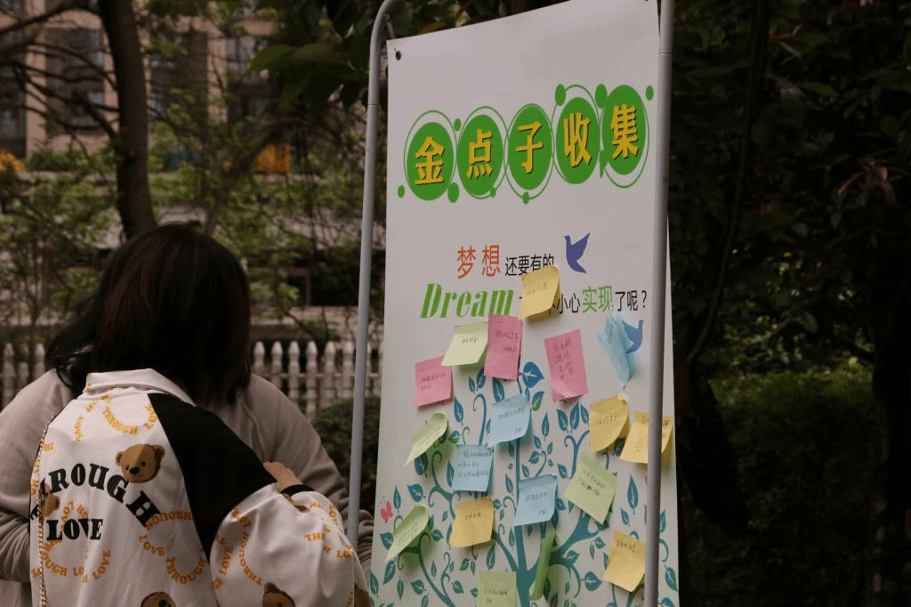 伴随着开场舞《I’s OK》,义演活动正式开始。志愿小队的两个小品《工院版还珠格格》和《开学了》点燃了全场热情;垃圾分类赢绿萝、拼图拼出美丽地球的互动游戏寓教于乐,在游戏中传达环保理念;同学们合唱了《我和我的祖国》、《没有共产党就没有新中国》,将活动又一次推上了高潮。在节目尾声志愿者们发起了“金点子收集”活动,大家纷纷为创造更好的社区环境写下了建议,志愿者们帮助社区居民整理好建议并将建议张贴在建议墙上。