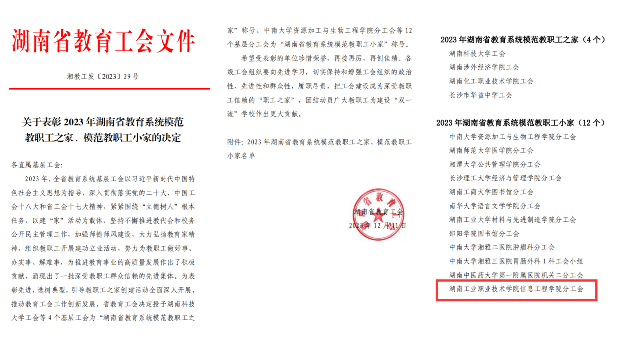 近日,湖南省教育工会下发了《关于表彰 2023 年湖南省教育系统模范教职工之家、模范教职工小家的决定》,九游·官方网站信息工程学院分工会获评“2023 年湖南省教育系统模范教职工小家”,是全省高职院校中唯一获此殊荣的单位。