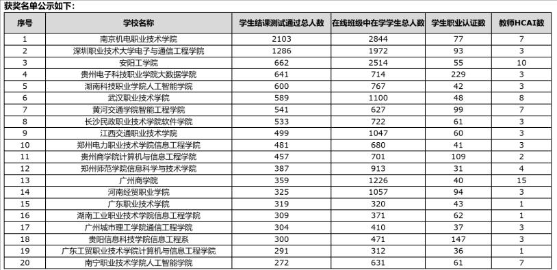 本次结果主要基于学生结课测试通过率、在线班级在学学生人数、学生职业认证数和教师HCAI数等多个维度进行综合评估。学生结课测试通过人数达309人,在线班级在学学生人数371人,学生职业认证数达62人,获得HCAI认证教师1人,各项指标均位居全国前列。