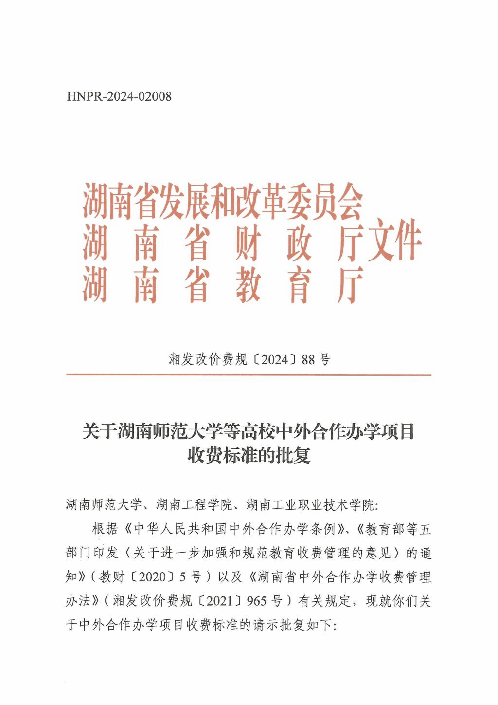 关于湖南师范大学等高校中外合作办学项目收费标准的批复(湘发改价费规〔2024〕88号).pdf
