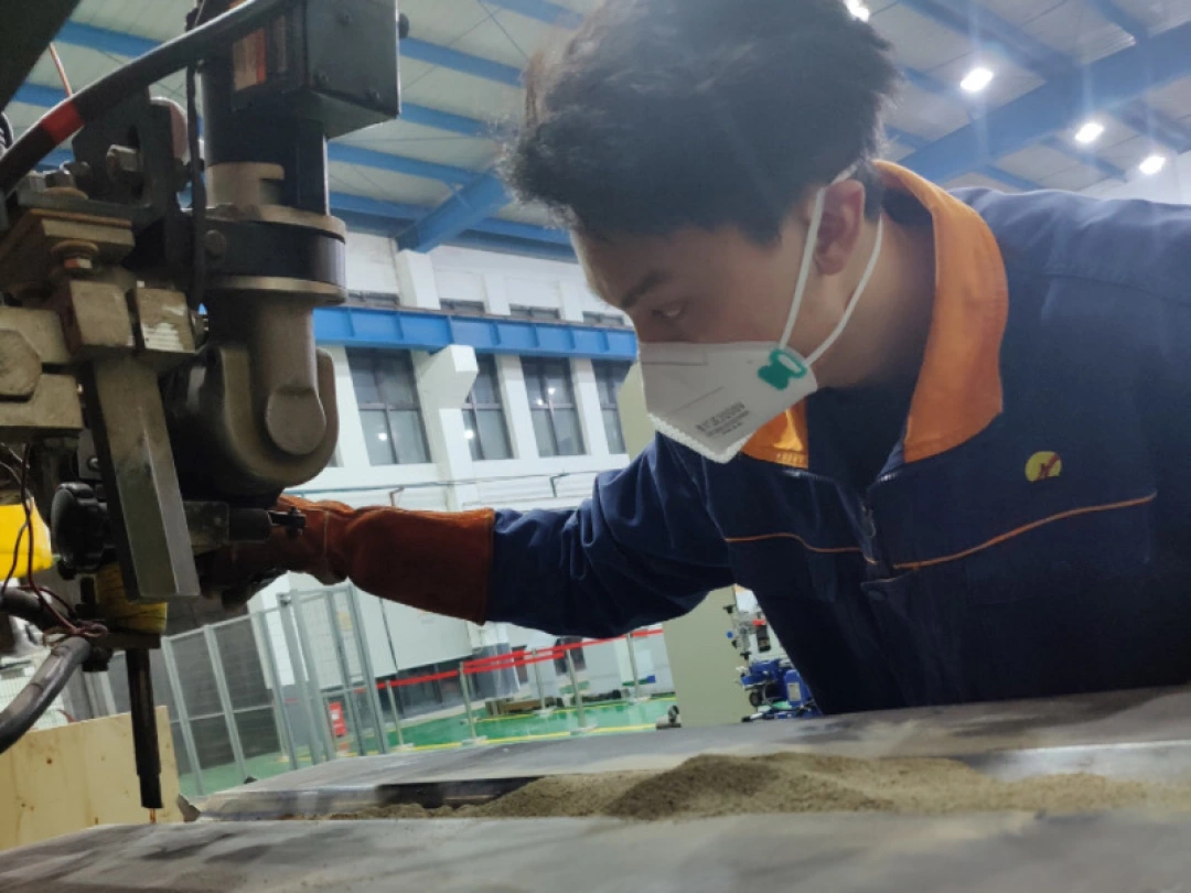 一座埋弧焊机前,田僮全神贯注地设置好电流电压参数及焊接速度,随后,他俯下身精准地调节好焊枪的角度,“嗞”电流声响起,焊枪在一块120毫米厚的长钢板上缓缓移动……这是田僮在“艾爱国焊接实验室”工作的一个场景。