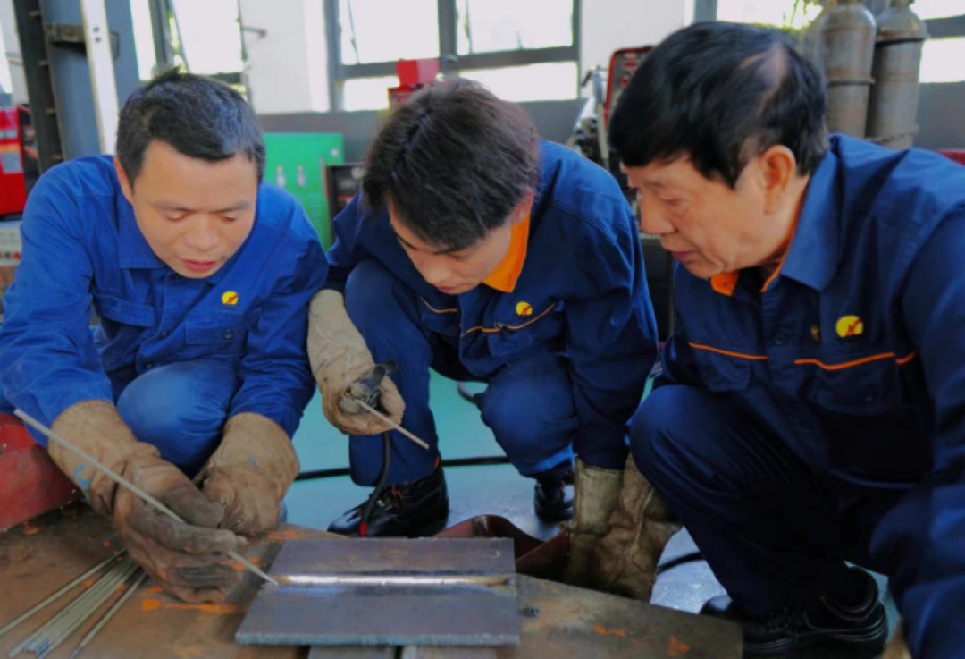 △艾爱国(右一)、欧勇(左一)示范焊条电弧焊的操作技巧。