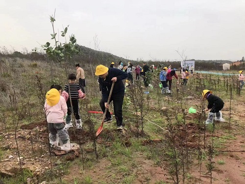 小朋友在学校志愿者的带领下,植树浇水,让社区更“绿”了