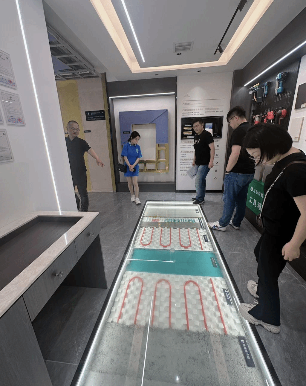 在凌佳总经理的引导下,教师们还参观了公司的样板间及施工流程展示间。在这里,教师们了解了点石装饰公司精湛的设计能力与优质的施工水平。工业设计与艺术学院2008届优秀毕业生、点石家装现任首席设计师谭伟向教师们分享了他的职业经验与心得,强调了实践经验在培养设计人才方面的重要性。