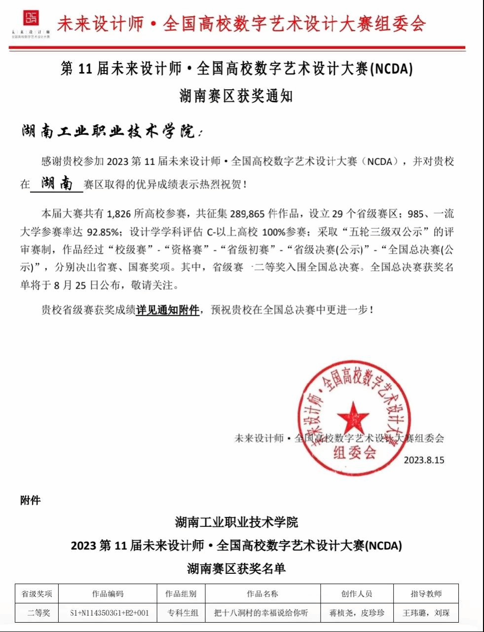 近日,2023年第11届未来设计师•全国高校数字艺术设计大赛(NCDA)获奖名单正式公布。其中,我院王玮璐、刘琛老师指导,蒋桢尧、皮珍珍同学创作的作品《把十八洞村的幸福说给你听》荣获动画与视频设计类省级二等奖。