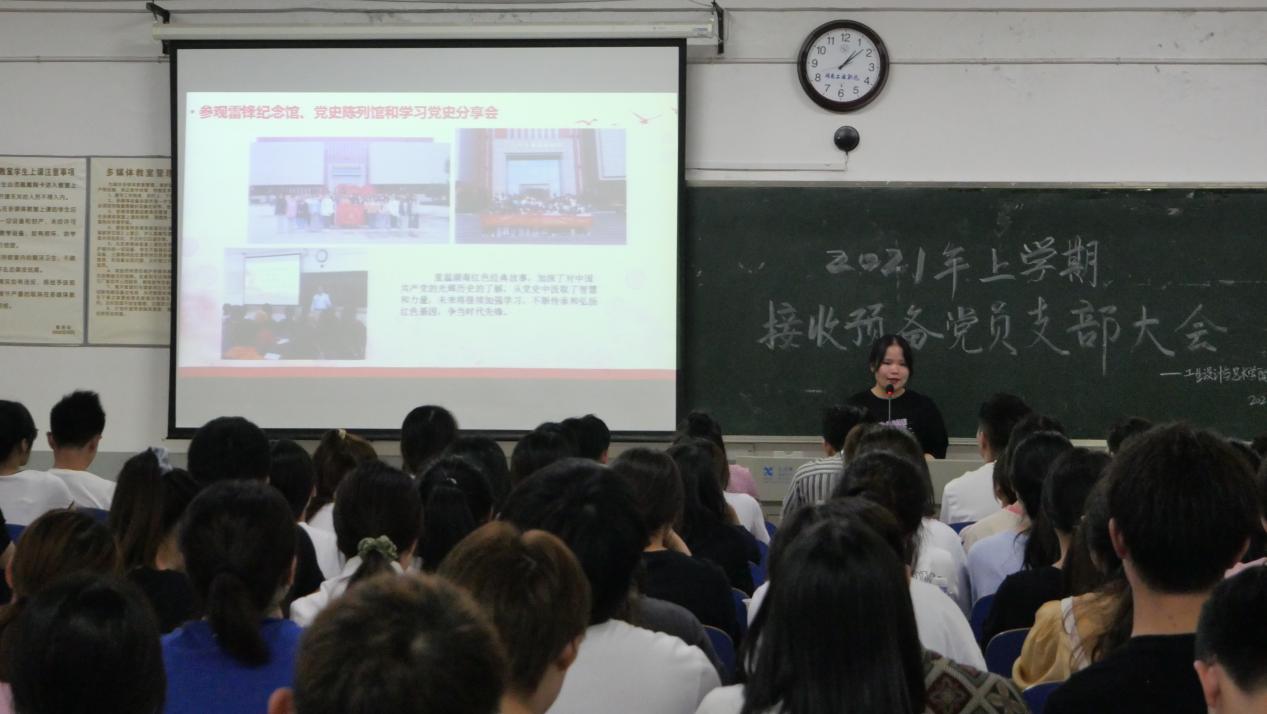 会议在庄严的国歌声中拉开序幕,陈丽萍宣读2021年上学期拟接收预备党员的29名同学名单,报告本次支部大会的相关情况。