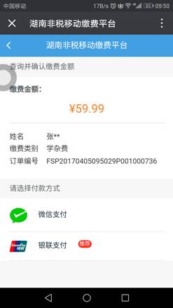 为方便家长用自己的银行卡为学生缴纳学杂费,本系统设置“微信支付”和“银联支付”为学生缴纳学杂费,各大银行银联卡银都可以进行“银联支付”,不用开通网银,不收取手续费;请缴费时一定要注意检查缴费人的姓名、身份证号码等信息,一旦发现不符立刻停止网上缴费流程,并使用其他缴费方式进行缴费,开学报到后到学校报到收费现场办理更改手续。
