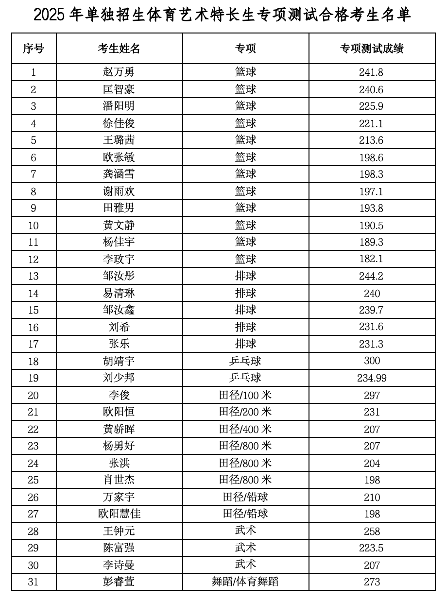 我校2025年单独招生体育艺术特长专项测试成绩合格标准为180分(满分300),达到合格标准成绩及以上考生视为专项测试合格,合格考生名单见下表: