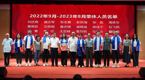 会上展示了获得2022-2023年省部级及以上荣誉的先进集体及个人名单,表彰了校企合作育人杰出企业及育人导师。副校长谢希钢为校企合作育人单位和个人导师代表颁发奖牌和证书,中联重科股份有限公司等十家企业,彭柱等十位老师接受表彰。
