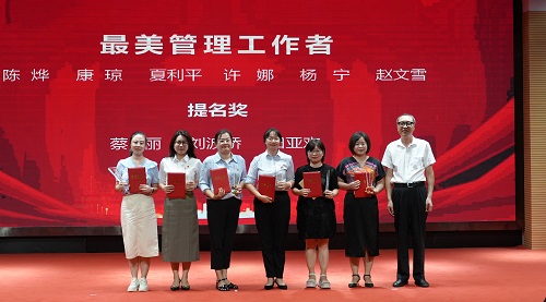 现场表彰了学校首届“最美系列”获得者,党委书记刘建湘为谌岚、成亚玲、符睿、胡敏、刘瑞已、彭雯、彭新竹、唐健豪、肖竺、周云10位“最美教师”获得者颁发证书,尚晓丽、王晋、王艳、杨幸获“最美教师”提名奖。纪委书记王波为陈烨、康琼、夏利平、许娜、杨宁、赵文雪6位“最美管理工作者”获得者颁发证书,蔡丽、刘波娇、田亚欢获“最美管理工作者”提名奖。副校长成涛为董琳、纪文婷、彭上、杨晶、易珺、张家臣6位“最美辅导员(班主任)”获得者颁发证书;贺盛、李娅、吴倩获“最美辅导员(班主任)”提名奖。副校长侯新华为龙华元、李丽慧、何德蒙、董志平4位“最美服务工作者”颁发证书;余金文获“最美服务工作者”提名奖。